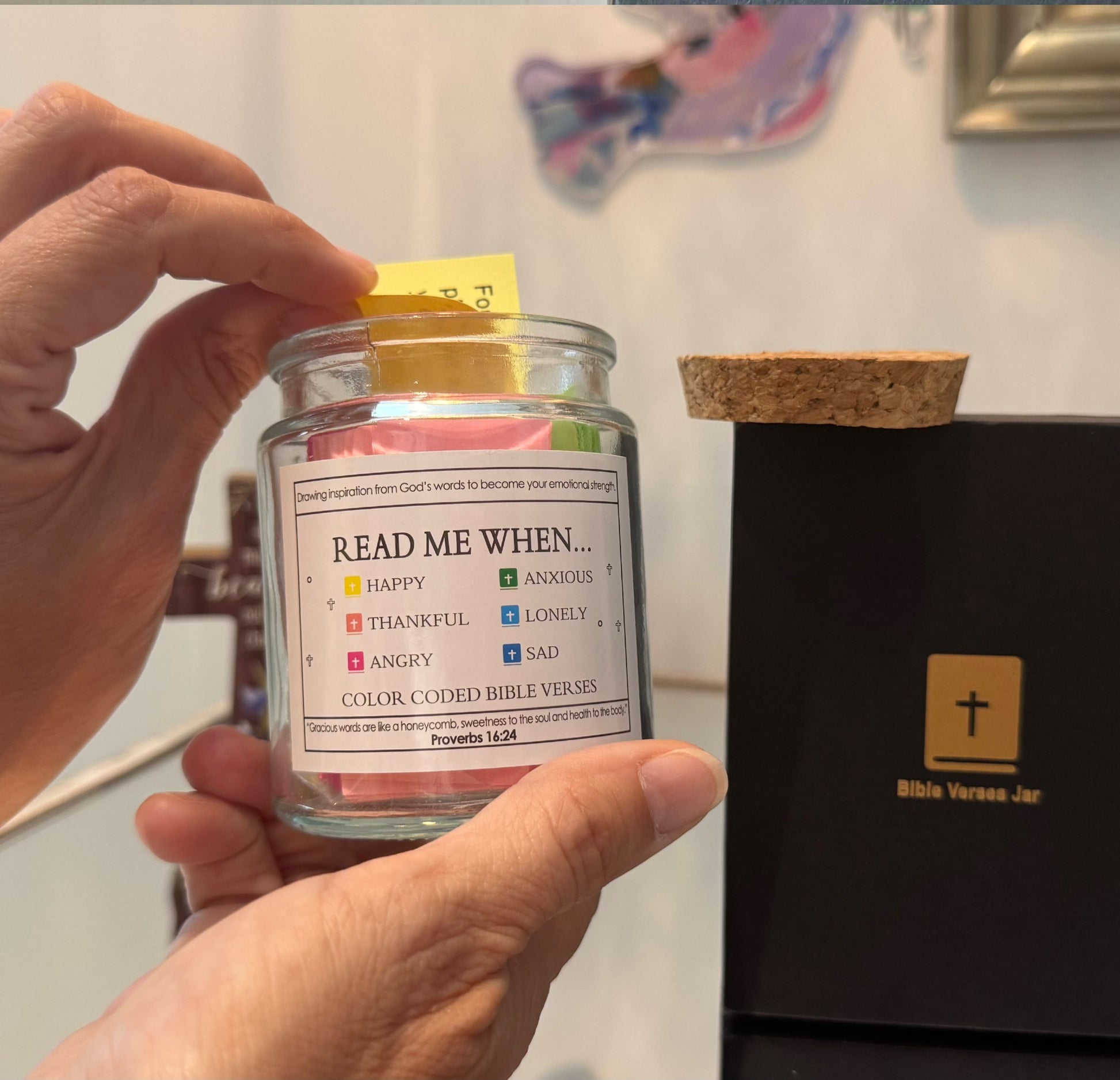 This is a heartfelt and inspirational collection designed to guide, support, and provide solace in times of emotional need. Encased within a beautifully crafted jar, these verses are carefully selected passages and quotes drawn from the Bible, each specifically curated to resonate with you or a loved one when they're needed most.